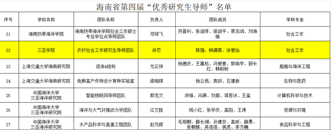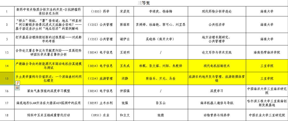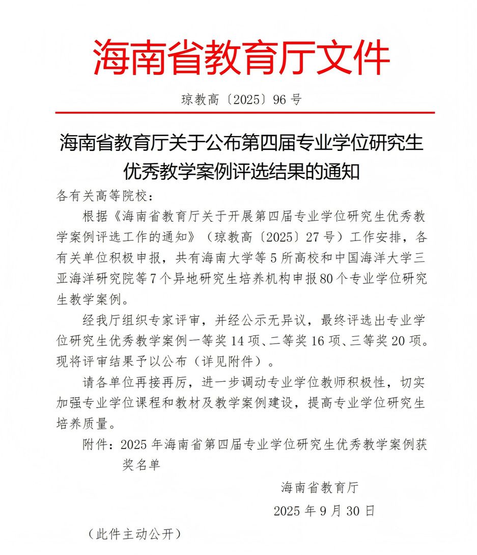 近日,海南省教育厅正式发布《海南省教育厅关于公布第四届优秀研究生导师和优秀研究生导师团队评选结果的通知》(琼教高〔2025〕95号)及《关于公布第四届专业学位研究生优秀教学案例评选结果的通知》(琼教高〔2025〕96号)。我校社会工作专业苏米雅教授获颁海南省优秀研究生导师称号,肖芒教授带领的农村社会工作研究生导师团队入选优秀团队;旅业管理学院、国际酒店管理学院闫静副教授牵头的《乡土美学重构与价值跃迁:一个滨海渔村的网红蝶变》教学案例,以及新能源与智能网联汽车学院王良成高级工程师牵头的《产教融合导向的新能源汽车驱动电机仿真建模与测试》教学案例,均荣获三等奖。