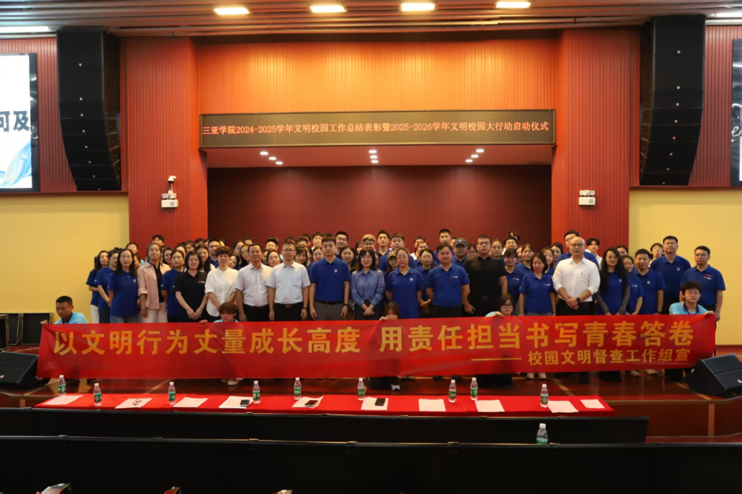 2025年11月7日下午,三亚学院书会堂内氛围庄重而热烈,2024-2025学年文明校园工作总结表彰暨2025-2026学年文明校园大行动启动仪式在此隆重举行。校领导高一兰在仪式上强调,校园文明是学校育人质量的重要体现,更是培养担当民族复兴大任时代新人的关键载体,号召全校师生以高度的责任感投身文明校园建设。