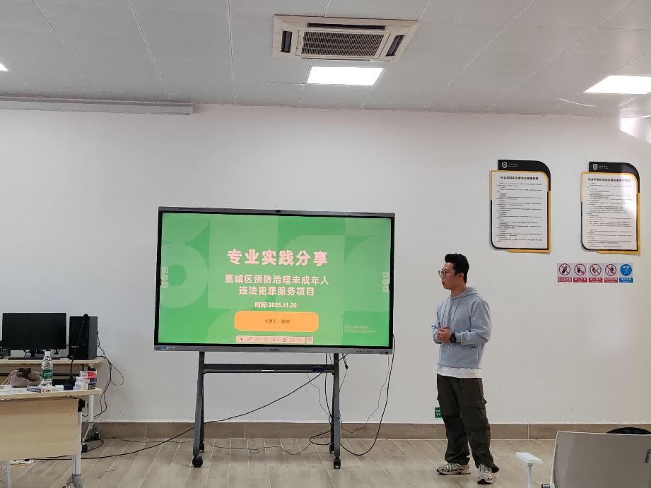 会议伊始,2024级社会工作专业研究生代表分享了他们在专业实践一线取得的丰硕成果。2024级社会工作专业研究生骆健同学详细介绍了其在广东省惠城区参与的“预防治理未成年人违法犯罪服务项目”。作为项目核心成员,他运用社会工作专业方法,深度介入64个个案,并创造性将社会联结理论应用于司法社工前沿领域,成功帮助34名青少年重返校园、7人实现就业。其参与编撰的实务手册获政府认可并印发,展现了社会工作在基层社会治理中的专业价值与实践效能,其扎实的实务能力也获得了实习单位的高度评价。