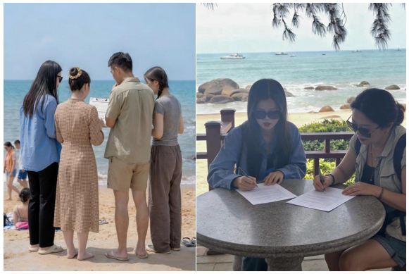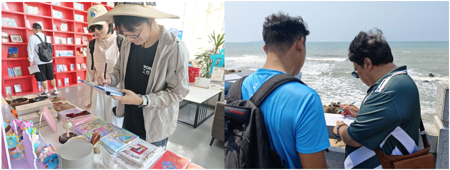 活动现场,同学们分组深入景区核心游览区、游客服务中心、文创商店、滨海体验区等点位,主动与不同年龄段、不同地域的游客耐心沟通,细致收集一手数据与真实反馈;同时针对景区一线服务人员、业态经营者开展访谈,全面了解景区日常运营、服务保障、业态管理等实际情况。